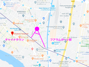 タイマスターの方々の中では割と有名なのでご存知の方も多いかもしれませんが、チャイナタウンとフアラムポーン駅の間辺りに立ちんぼゾーンは存在します。とりあえず下記マップのロータリーを目指しましょう。