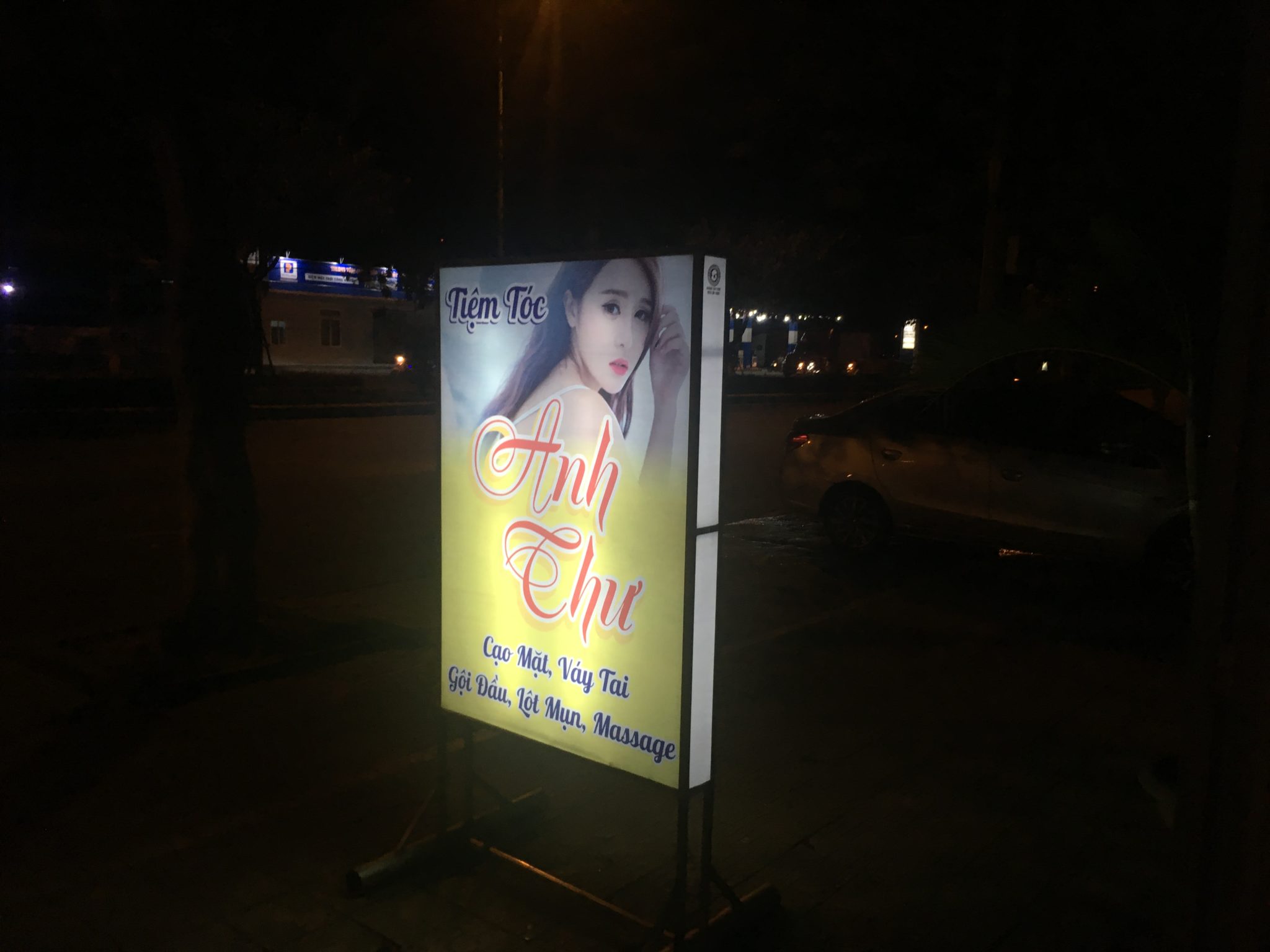 私は知人に場所を聞いていたので、レンタルバイクで現地へ向かったのですが、怪しげなピンクの光と床屋の看板が見えてきました。すぐにこれだ!とわかりました。